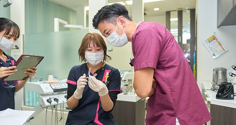 当院では歯周病治療・予防のほかに矯正にも力を入れております。将来的に矯正を出来るようになり、キャリアアップしたいという向上心のある方に最適です。また、初期治療やTBIは少し苦手だなと言う方は、適性に応じて、カウンセリング、外科手術のアシスタントなども学ぶことが出来ます。Drがスタッフに対して数多くの技術指導や講義を行ってくれます。もちろん、外部セミナーへの参加に対しても金銭的な補助をいたします。